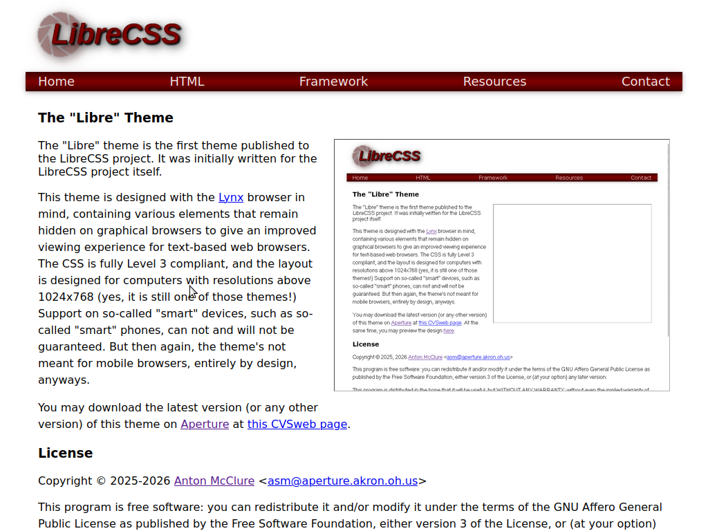 The "Libre" theme is the first theme published to the LibreCSS project. It was initially written for the LibreCSS project itself.